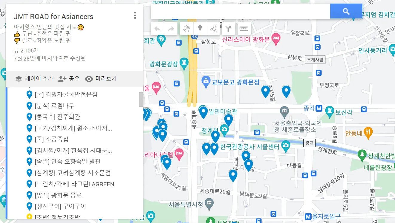 종류 별 맛집 리스트와 심지어 색으로 구분된 맛집 단계!!